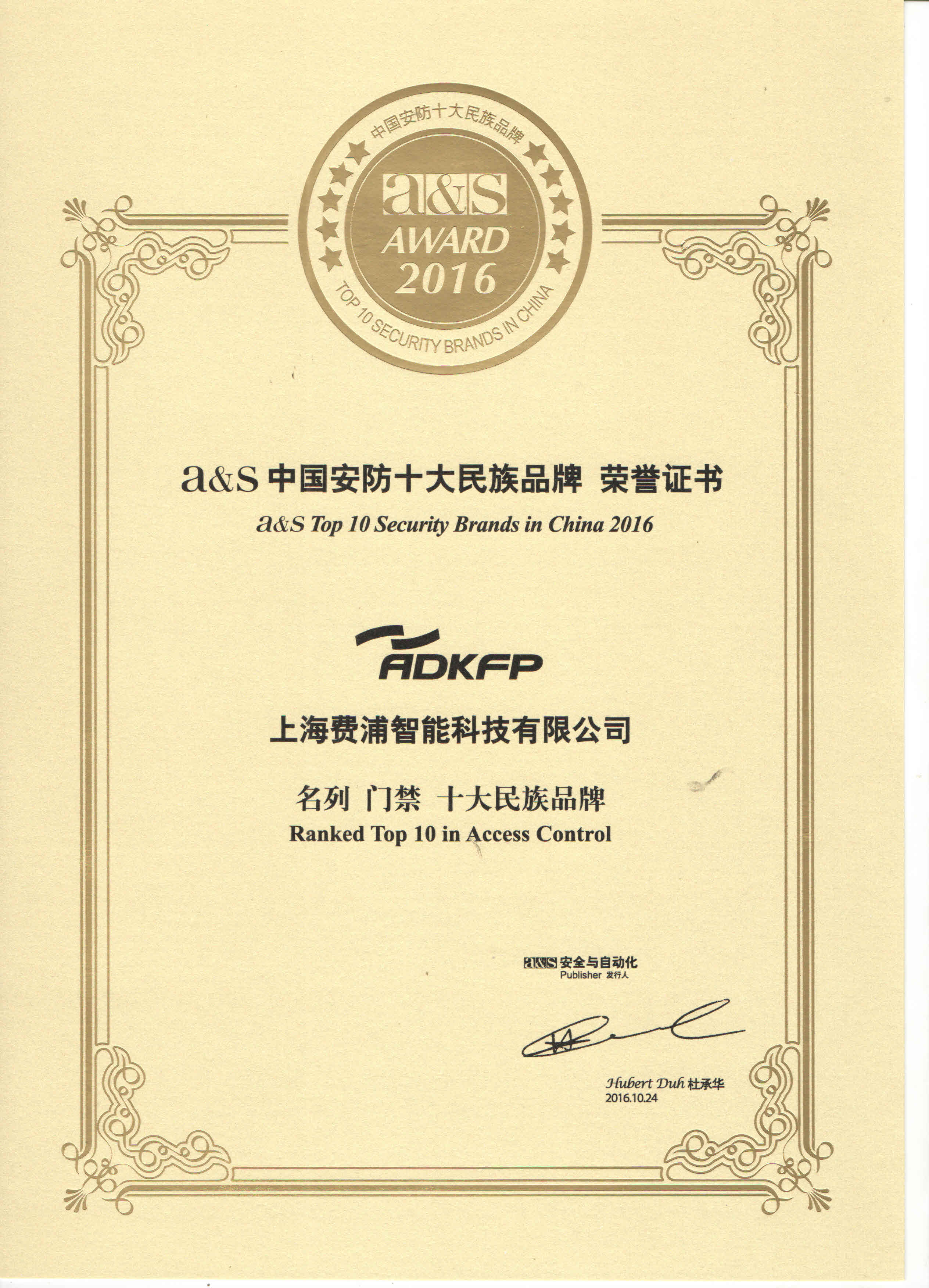恭喜ADKFP 費(fèi)浦 榮獲2016 a&s 中國安防十大民族品牌門禁類
