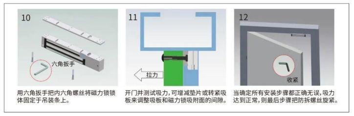 1、安裝磁力鎖吸板的時(shí)候,螺絲不要擰太緊,要讓橡皮墊圈保持適當(dāng)?shù)膹椥?,以便吸板可以自?dòng)調(diào)整到正確的位置,讓吸板和鎖體吸合的更緊。