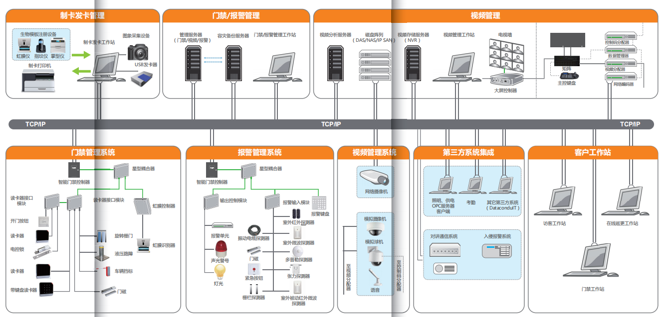 一體化集成設計,包括界面、數據、信息、第三方業(yè)務集成,實現了門禁、視頻、報警、廣播、對講等多個子系統(tǒng) 的整合集成和統(tǒng)一管理。